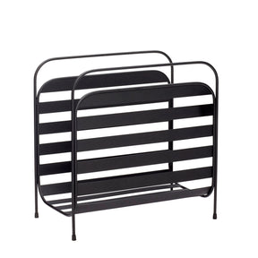 The magazine holder is made from black metal and can hold and store multiple magazines and books due to its larger size. The shaping of the black metal creates a unique and stylish look.